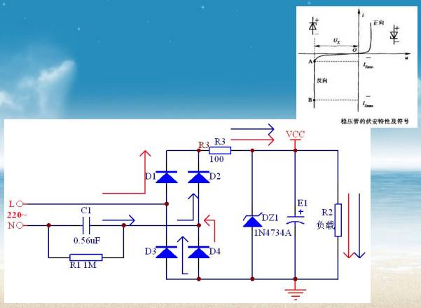 采用半波整流方式,根據(jù)計(jì)算式I1=0.5|I|=34500C可知,C=0.43uF。所以此處選用0.47uF的電容,反過(guò)來(lái)可以驗(yàn)證提供的電流I1=34500C=16.2mA,多余電流從穩(wěn)壓管流過(guò)。