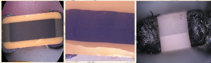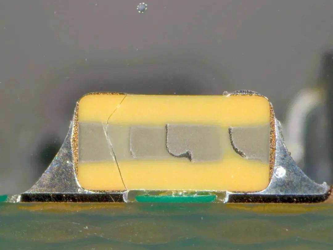 電容在受到過強熱應(yīng)力沖擊時,產(chǎn)生的裂紋無固定形態(tài),可分布在不同的切面,嚴(yán)重時會導(dǎo)致在電容側(cè)面形成水平裂紋。