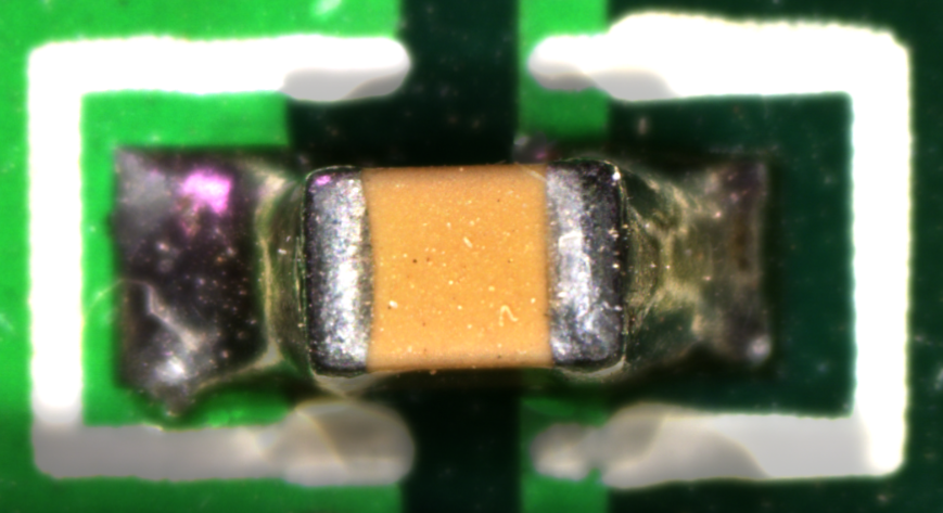 首先使用超景深數(shù)碼顯微鏡進(jìn)行外觀立體觀察,檢查電容表面是否有開裂,多角度檢查引腳側(cè)面焊錫爬升情況。電容外觀完好,沒有外部裂紋,焊錫爬升良好。