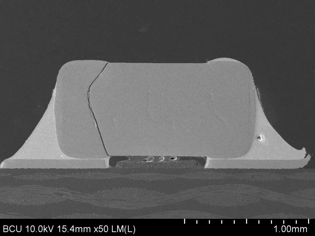 對電容進(jìn)行金相切片處理,可以清楚地看出,電容內(nèi)部裂紋起源于焊端附近,呈Y字型,這是典型的機械應(yīng)力裂紋形貌,對照可能的應(yīng)力源排查,規(guī)范操作過程,最終解決電容開裂問題。