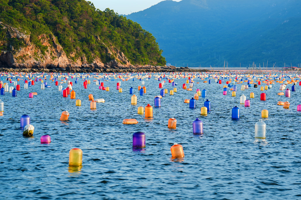 迎著清爽的海風(fēng),我們啟航駛?cè)肴绠?huà)的西線(xiàn)海域。這里碧波萬(wàn)頃,天光云影共徘徊,最令人驚嘆的是色彩斑斕的生態(tài)環(huán)保浮球方陣在朝陽(yáng)映照下形成一片“彩虹?!薄R排列的浮球在陽(yáng)光下閃爍,宛如一串串彩珠綴于蔚藍(lán)綢緞,勾勒出獨(dú)特的海洋詩(shī)畫(huà)。